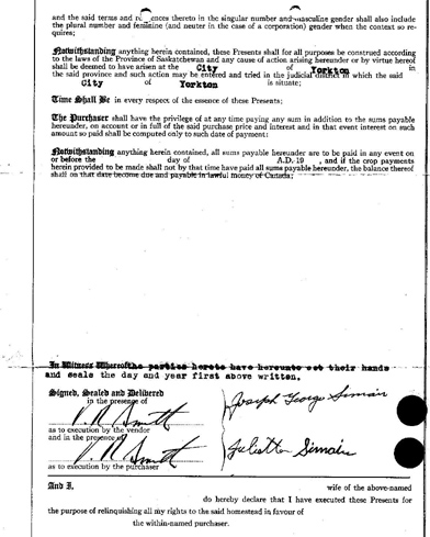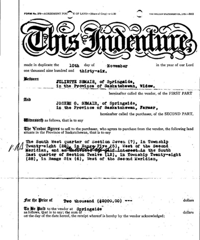 Land Purchase Indenture between Juliette and son Joseph Simair, 1936.